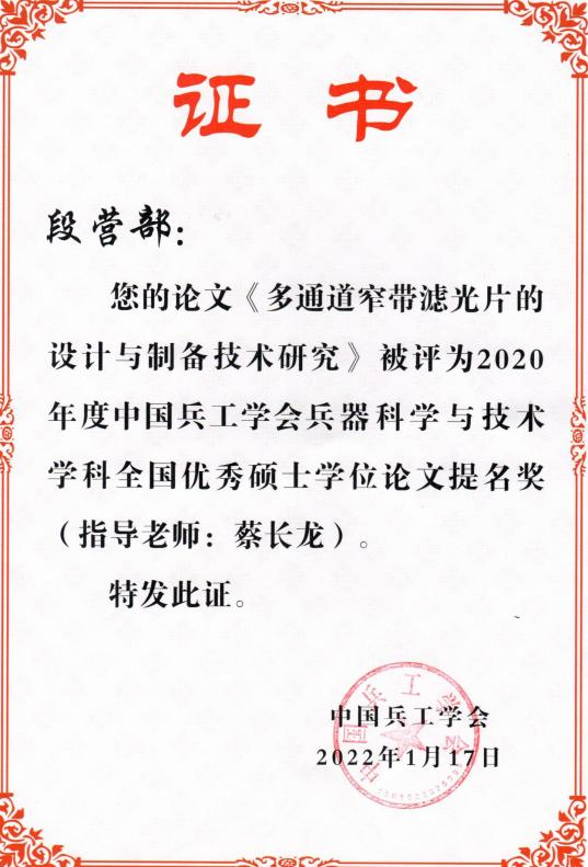 2022年1月17日,中国兵工学会公布了第五届兵器科学与技术学科全国优秀博士、硕士学位论文评选结果。本次评选共评出19篇优秀学位论文及提名奖,其中优秀博士学位论文4篇,优秀博士学位论文提名奖4篇,优秀硕士学位论文10篇,优秀硕士学位论文提名奖1篇。beat365官网兵器科学与技术学科硕士生段营部的硕士学位论文“多通道窄带滤光片的设计与制备技术研究”荣获优秀硕士学位论文提名奖,这是beat365官网首次获此殊荣。