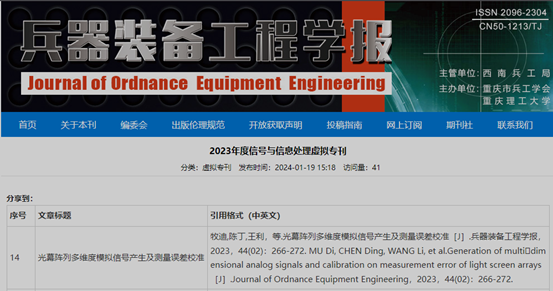 beat365官网20级兵器科学与技术学科硕士生牧迪在《兵器装备工程学报》期刊发表的论文—“光幕阵列多维度模拟信号产生及测量误差校准”,近日经优选后被收录进《兵器装备工程学报》2023年度信号与信息处理虚拟专刊。该论文主要阐述了一种多维度模拟信号产生方法可实现对弹丸多个飞行参数测量结果进行有效的校准,该方法可使校准误差小于1mm,且在校准精度、实验效率、安全性、运行成本等方面具有优势。2023年度信号与信息处理虚拟专刊网址:https://bzxb.cqut.edu.cn/newsinfo.aspx?id=1458