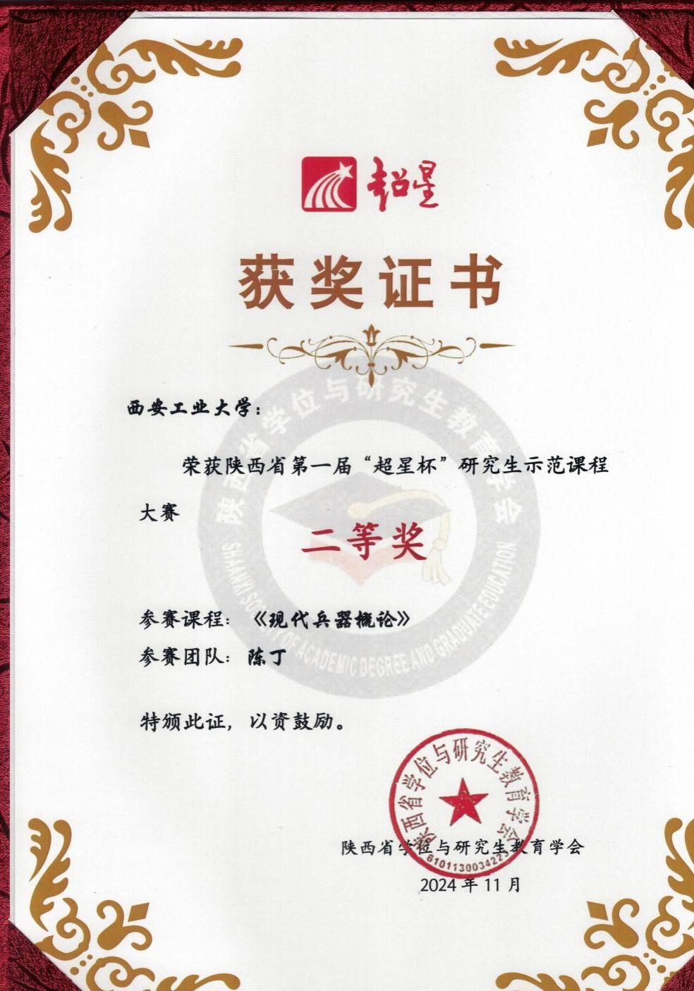 11月1日下午,陕西省第一届研究生示范课程大赛颁奖仪式暨2024年陕西省研究生示范课程建设会议在西安万丽酒店举行。本次大赛由陕西省学位与研究生教育学会主办,超星泛雅集团协办并提供赞助。本次大赛旨在进一步提升陕西省研究生教育质量,推动研究生课程教学的创新与发展。beat365中文官方网站高度重视此次大赛,积极组织院内教师参与,经过严格筛选和精心准备。最终,陈丁副教授负责的研究生课程《现代兵器概论》通过研究生院选拔代表学校参加本次赛事。