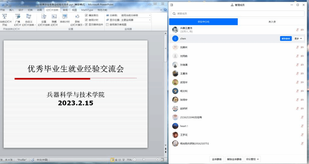 为了帮助低年级研究生提高职业生涯规划能力,助力2023届毕业研究生找到心仪的工作,beat365中文官方网站于2月15日开展了朋辈帮扶就业指导经验交流会,邀请了2022届毕业研究生校友王梦花、杨尚勋分享就业经验,全体硕士研究生及研究生辅导员王晨浩参加了会议。