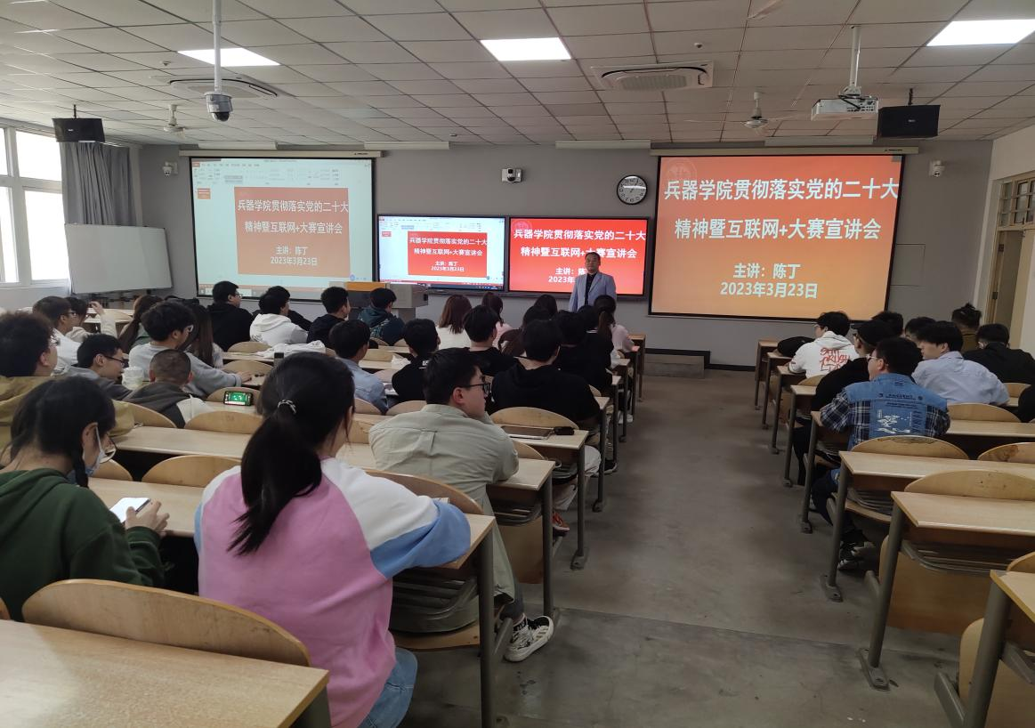 为深入贯彻落实党的二十大精神和全国教育大会精神,全面落实习近平总书记给中国“互联网+”大学生创新创业大赛“青年红色筑梦之旅”大学生的重要回信精神,激发beat365中文官方网站学生创新创业热情和创造力,切实提高学生的创新精神、创业意识和创新创业能力。2023年3月28日中午1点,beat365中文官方网站在教2-208召开了互联网+大赛宣讲会,参与本次宣讲会的有兵器与科学技术学院本科生、21级研究生、22级研究生。为此我们邀请了兵器与科学技术学院武器系统与工程系副主任、硕士生导师陈丁老师来给大家从技术角度讲解互联网+项目如何撰写。