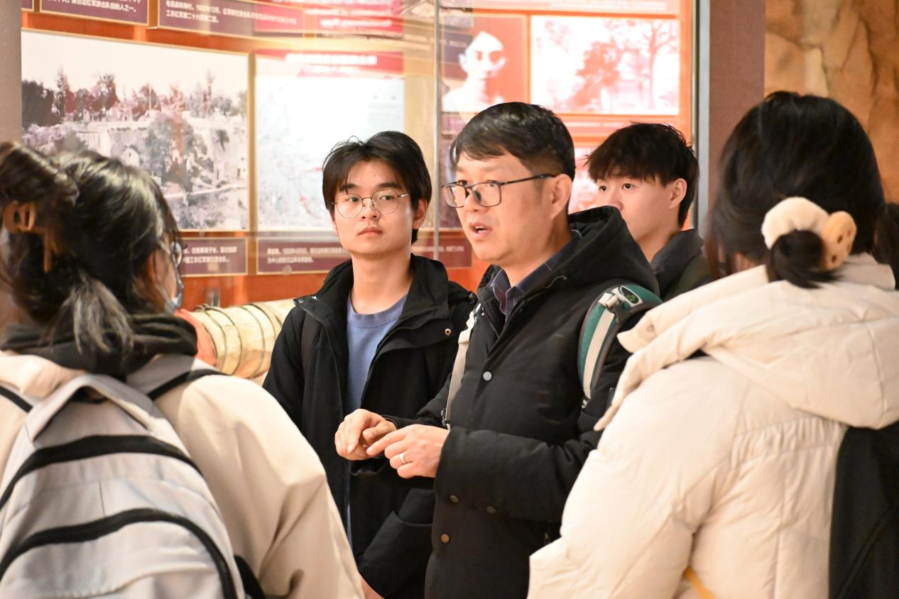 研学首站,师生走进延安革命纪念馆。在馆内的影像展区,王国栋驻足于多组珍贵历史影像前,结合延安时期自力更生的大生产运动、全心全意为人民服务的鲜活案例,为学生骨干逐帧解读。他详细讲述影像中革命先辈在简陋条件下谋划抗战策略、与群众同劳作的故事,点明这些画面正是延安精神中坚定政治方向与艰苦奋斗品质的生动写照,让学生们对精神内涵有了更具象的理解。
