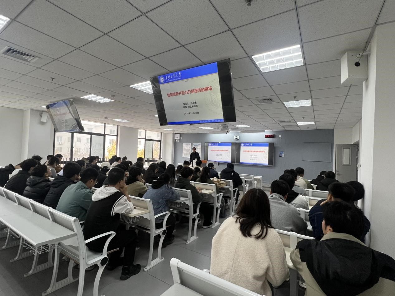 苏俊宏教授结合选题与题目、开题报告的基本结构、开题及开题报告的定义、撰写方法、要求与建议等多个维度展开深入讲解,重点围绕研究生开题的相关事项对同学们在准备阶段所存在的共性问题进行了梳理,根据自己的经验与体会,在开题报告写作方法技巧给予了相应的指导。他在讲授中指出,一份优质的开题报告是学位论文成功的关键基石,对待开题报告务必秉持严谨的态度,广泛涉猎文献,拓宽并深化研究视野,反复斟酌打磨开题报告。